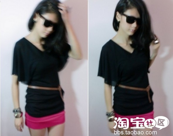 黑色蝙蝠袖的针织衫,超级修身的剪裁。很显瘦的一款哦
