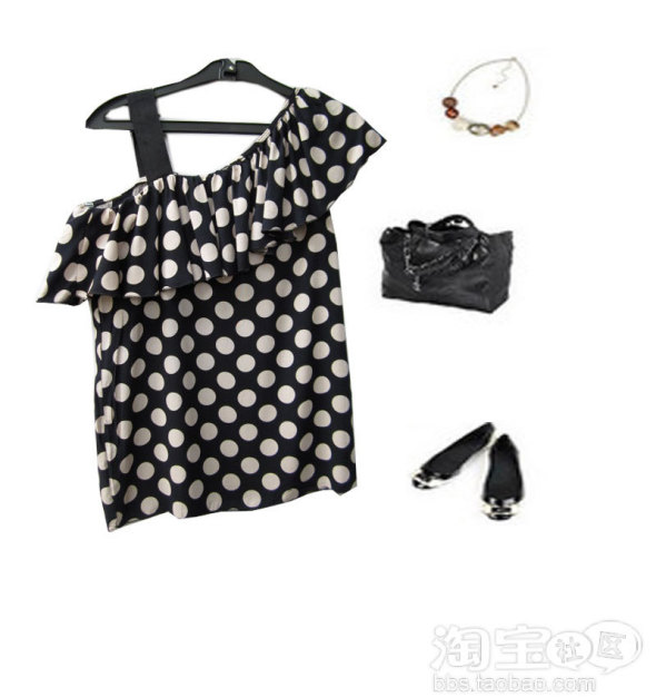 韩版大荷叶边斜肩单肩吊带圆点上衣 短袖上衣 团价39.6