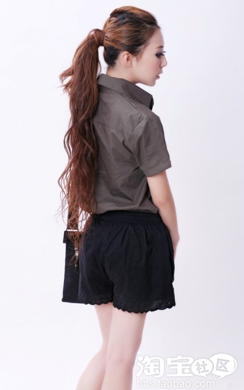 学院风格 复古 军绿色 衬衫+黑色花边 宽松百搭短裤 复古英伦