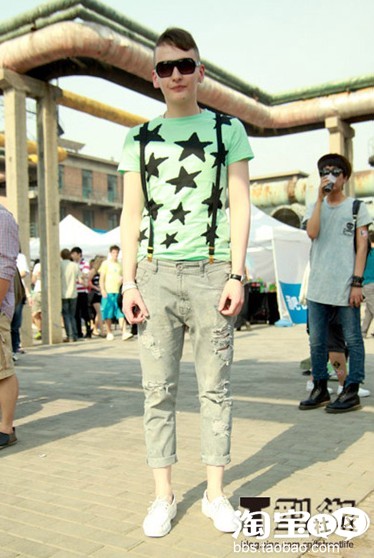 当然行,如果能配合今天运动型的上身打扮就更好了.把裤管捋高到膝盖下面,再把裤子整理得有层次一点.看看,不错吧: