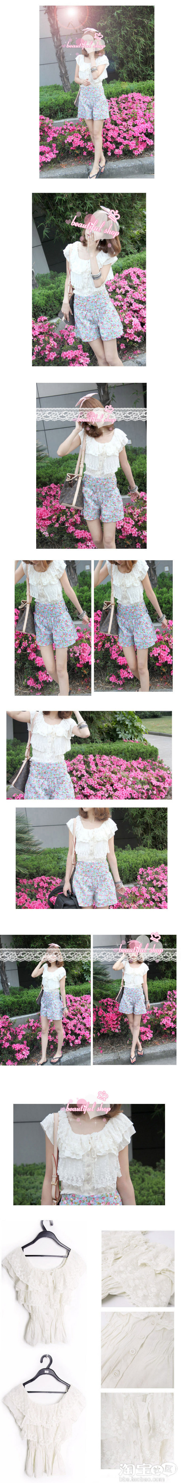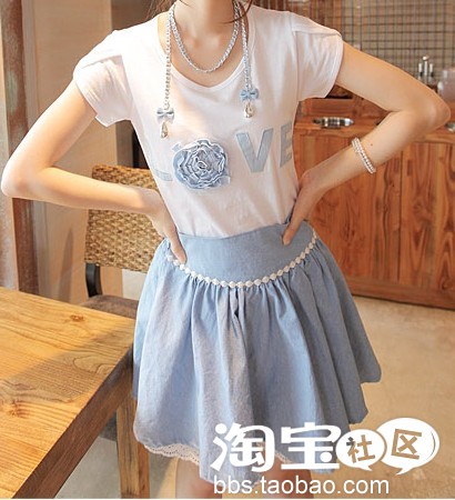 白色T+短裙 个性的白T胸前的浅蓝色小花 成为最醒目的主角,给人一种清新可爱的感觉,和裙子又同色,这套搭配,可以说专属萝莉王国的