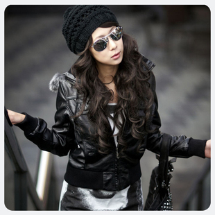 时尚之都上海 韩版都市丽人 修身黑色真毛帽条皮衣 F15