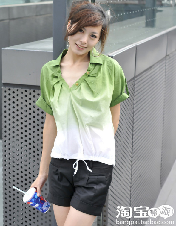 干干净净的绿色渐变翻领衬衫十分利落,搭配同样简约的短裤,