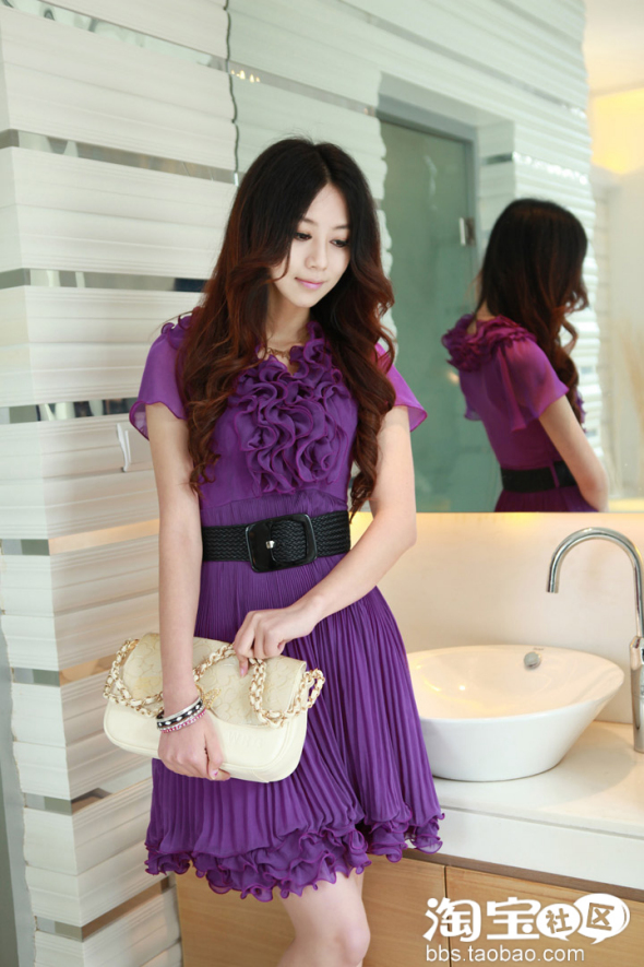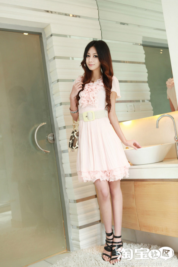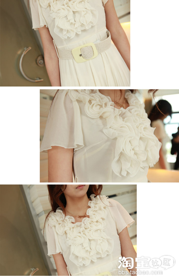 裙摆采用全新的工艺,雪纺压成细细的褶皱,轻盈飘动。