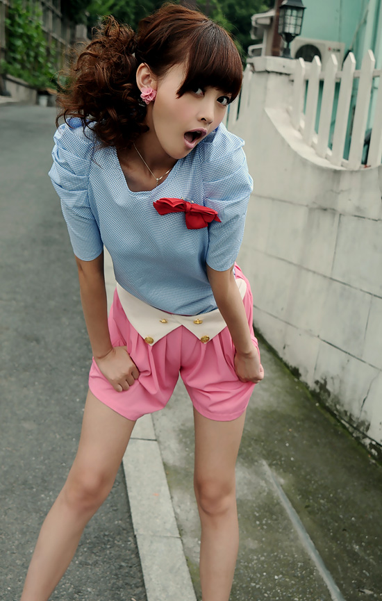 粉蓝耸肩衬衣+高腰短裤