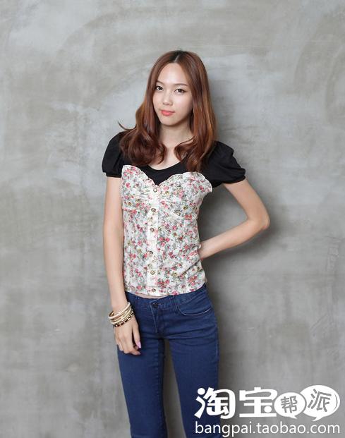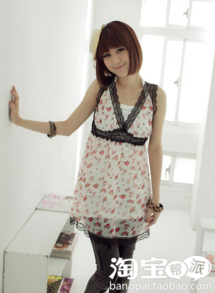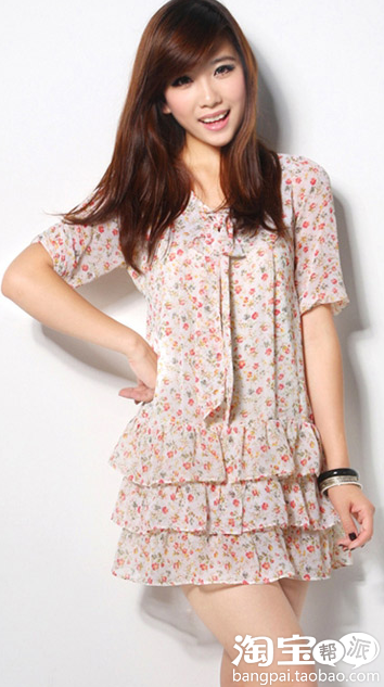 小碎花雪纺衫,也可作连衣裙穿,领口、背部、胸下围都采用了松紧设计,很修身,还配有一个漂亮的胸花,让你立即变回娃娃哦