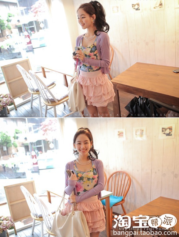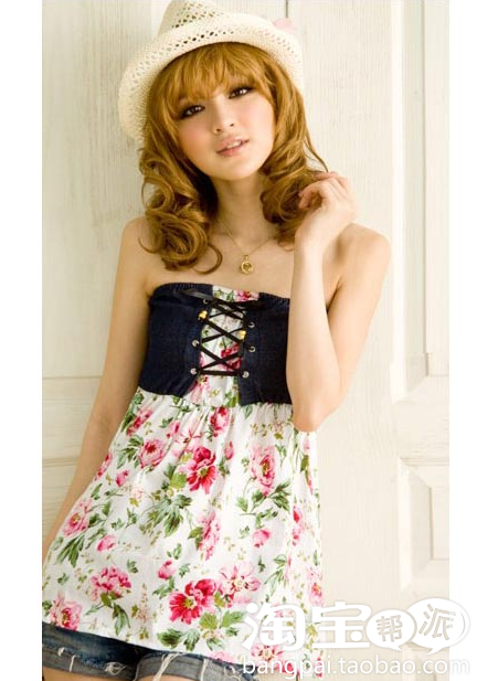复古样式的碎花抹胸搭配泡泡袖底衫,适合年龄稍大的轻熟女。虽然仍保有邻家女孩儿的清纯之感,但在眉宇之间多了几分女人味。