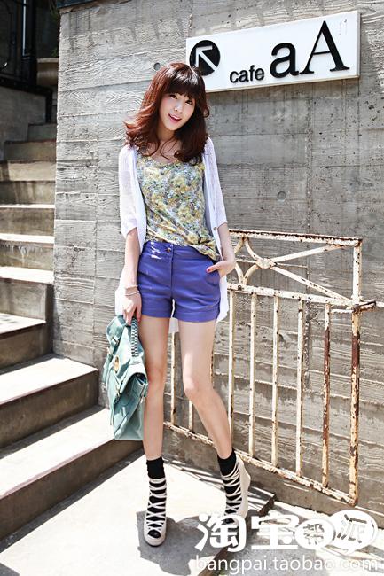 印花T恤搭配亮紫色短裤,白色开衫,基础款单品的组合重在颜色的选择。亮紫色减龄效果明显,同时素雅的碎花T恤不失沉稳。