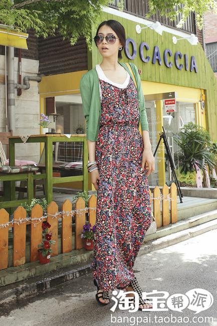 民族风格V领长裙内搭黑色背心,打造妩媚而修长的身形。长裙搭配切忌老气横秋,选择罗马风格凉鞋和同色系机车包包可以增添时尚度。