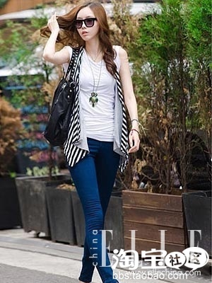 这种非常有造型感的马甲适合任何身材的美眉,不规则的剪裁垂坠感强烈,既可以遮盖赘肉,又可以掩饰过瘦的身材。单色调的竖条纹在整体视觉上看起来更修长,而且随着脚步衣襟摇摆,非常有风格。搭配牛仔长裤,干练而不失女人味。
