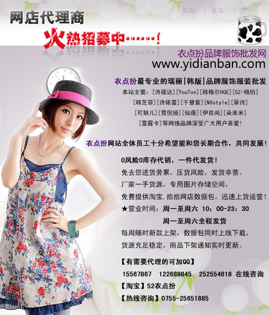 衣点扮服饰批发网是国内最早从事网络服装批发的网站之一,主营品牌女装批发、网店货源、女装网店代理、品牌服装批发,以网络为销售平台,为您提供潮流时尚、质优价廉的最新瑞丽日韩款式服装,主要针对18-40岁之间的青春活泼,时尚白领女性,每周上百款新品上市,真人实物拍摄,非杂志图片款,货源充足,是全国各地经营中高档女装批发商及服装店,