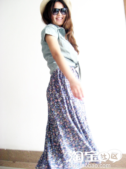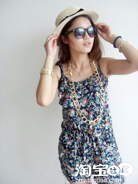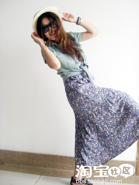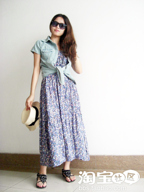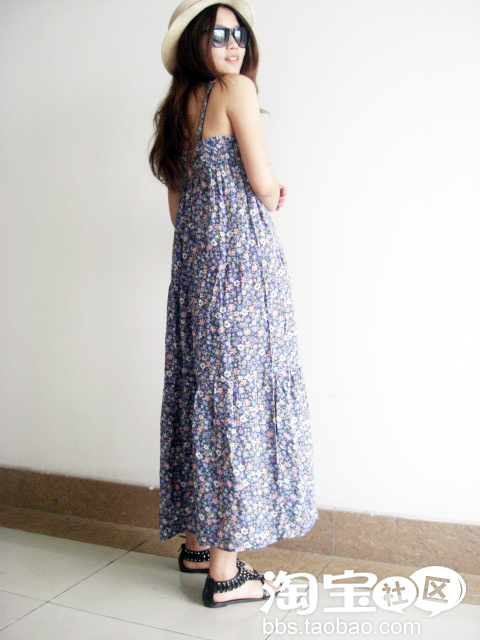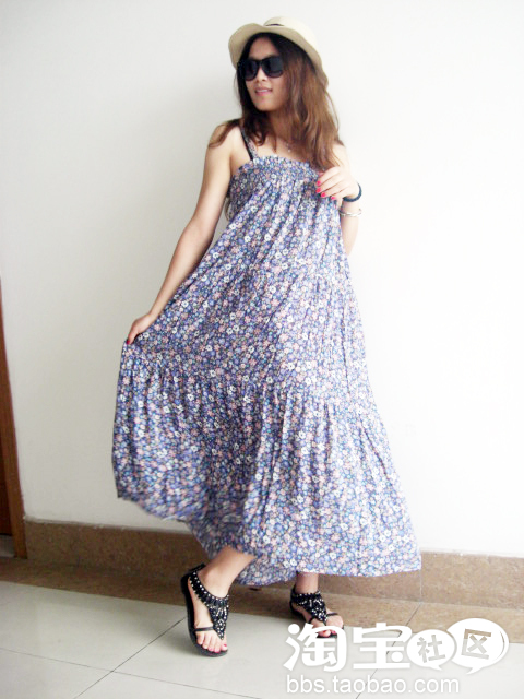 这样的优质棉质碎花长裙 搭配草帽 墨镜