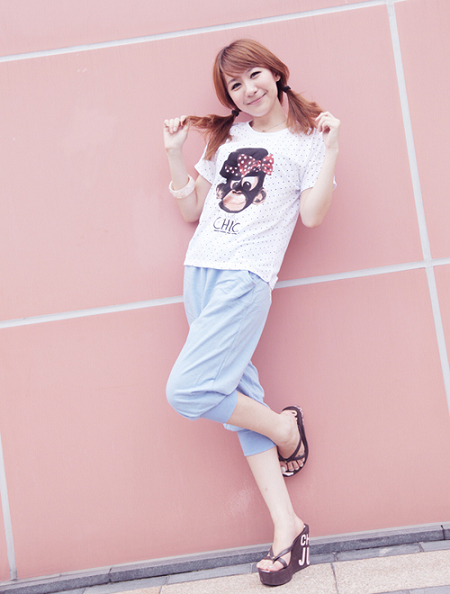 k.独特的印花图案,宽松板型T恤,搭配适合夏日的七分裤,百搭的跛哏凉鞋,让清爽冲淡夏天的炎热