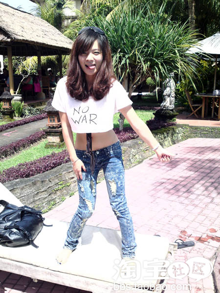 白色露肚脐的no war t恤+破洞的雪花破洞牛仔裤
