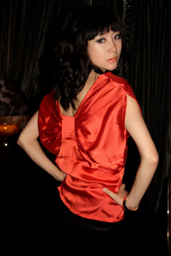 8、高纯度亮色系真丝大蝙蝠袖上衣+黑色贴闪石西装半裙+粗金属蛇链+银手镯&五彩宝石镯