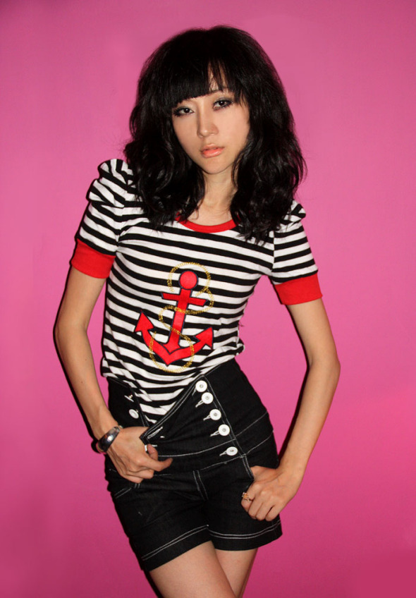 6、海魂衫+复古双排扣高腰牛仔短裤