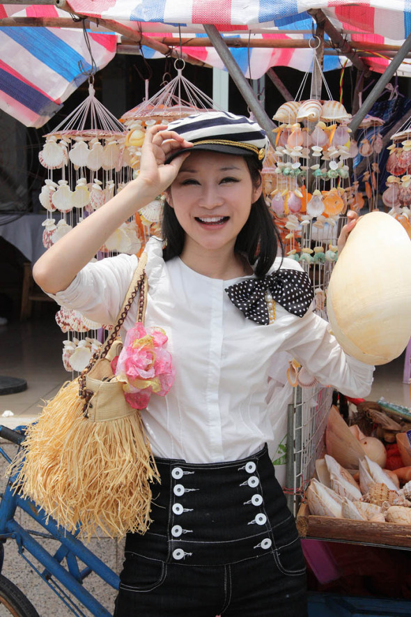 4、蓝白条军帽+蝴蝶结泡袖衬衣+复古双排扣高腰牛仔短裤+巴厘岛风情流苏手工草编包