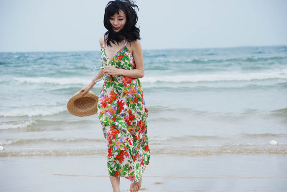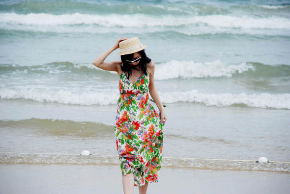 1、纯棉花柄吊带长裙+原色编织草帽+白色太阳镜
