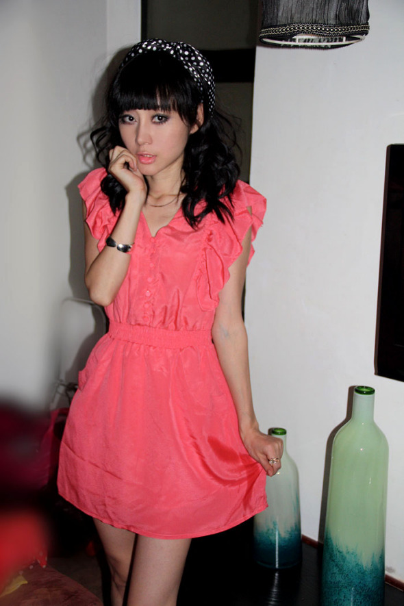 9、甜美荷叶袖松紧带收腰连衣裙+黑白波点头箍