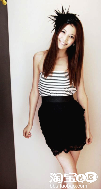 这是条黑色蕾丝半裙 我自己搭配了件条纹抹胸 感觉上班逛街都能穿