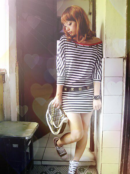 经典条纹时尚蝙蝠袖加上铆钉装饰