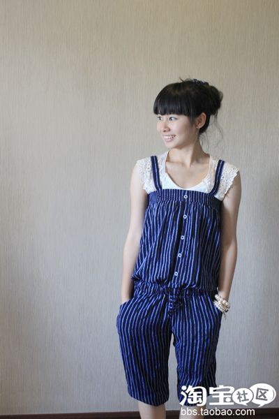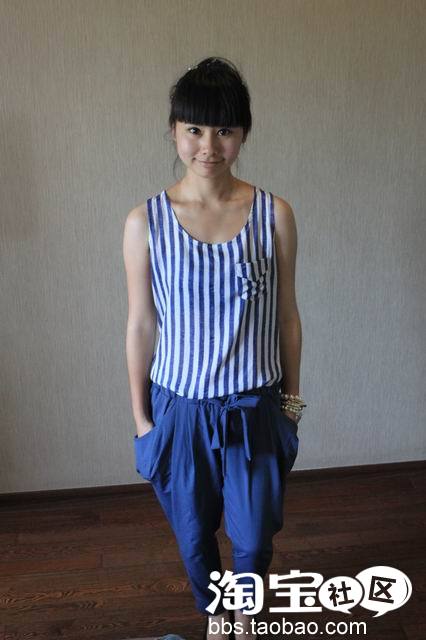 蓝色搭配今年最流行的哈伦裤,这个哈伦裤的料子的设计师很精心,料子是那很凉快的那种