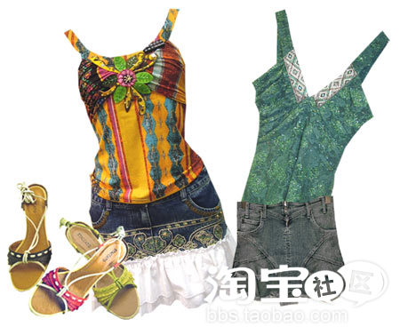 左:色彩跳跃亚热带风情的泡泡纱短袖,宽大的手工编制领口怎能不让人遐想联翩。怀旧色彩的牛仔短裤,黄色的线条改变了一贯的单调。