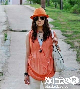 橘色上衣属暖色调,橘色映衬皮肤偏黄的mm肤色有点橘红色,这样皮肤就不会那么偏黄,有点橘红色,能适度的调节肤色。