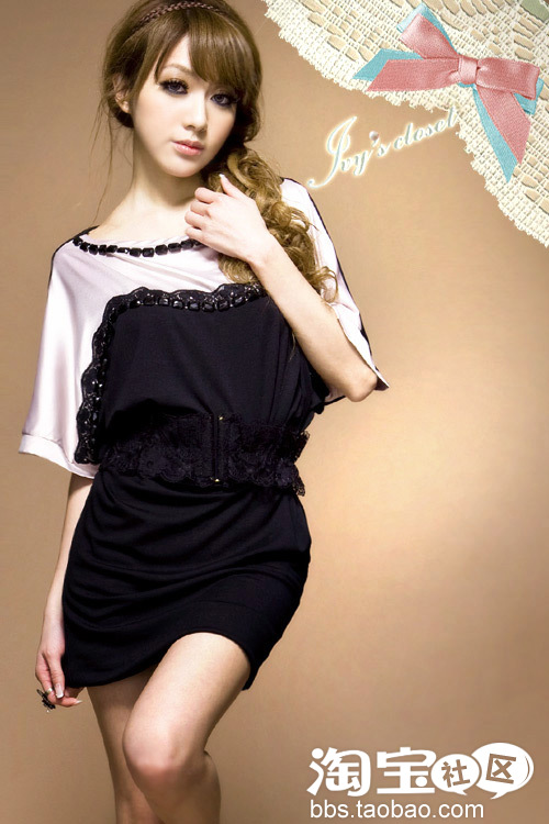 时尚优美新款女人味V领修身拼色连衣裙 - 粉+黑色 超甜美超有女人味的一款