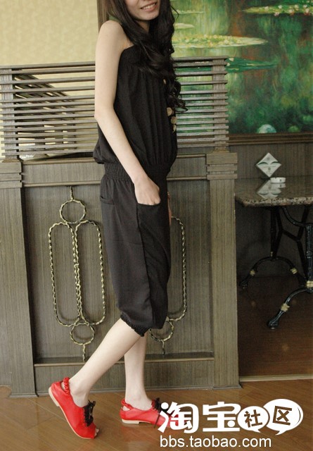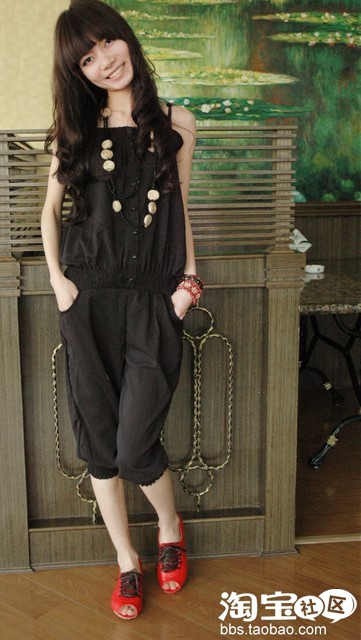 雪纺七分连身裤无疑是09秋季的热门单品,七分裤的大口袋和腰间的松紧设计凸显休闲意味,还能遮掩小肚腩,修饰腰腹部的曲线。再搭配双红色的鞋子,红黑对比强烈。