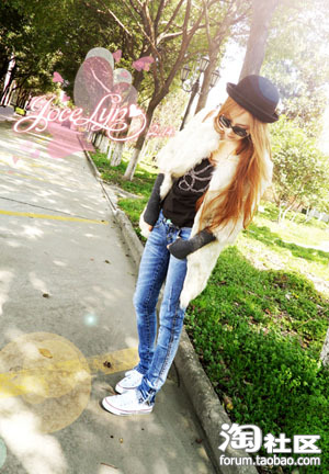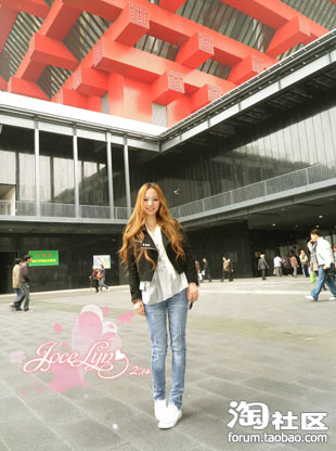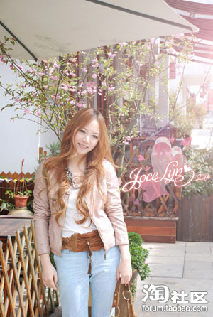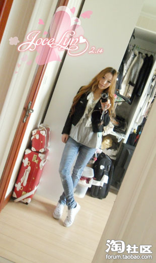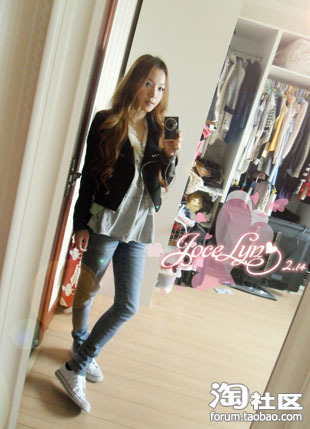 今天是机车外套,小熊长TEE,夹着蕾丝背心,(外露一点点蕾丝,把2硬朗的外套风味转的柔和一些,多了一点甜美的感觉)和修身牛仔裤搭配球鞋,很休闲,哈哈