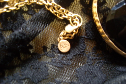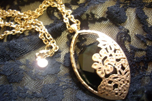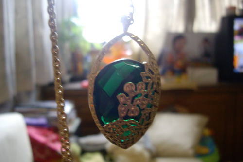 身上带的复古项链,那个石头是绿色的玻璃,很有分量……