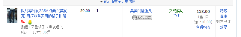 裤子59元,是ZARA的原单,买了两条,深色跟浅色的各一条,穿的是浅色格子的,卖家是http://vk-island.taobao.com/