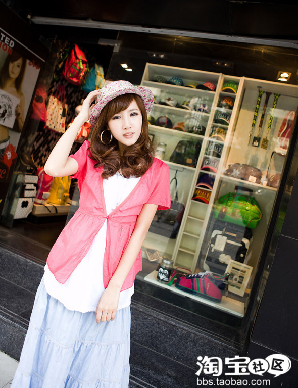 橙色tee+时尚帽+太阳镜+白色手提袋===活脱脱一个摩登女郎