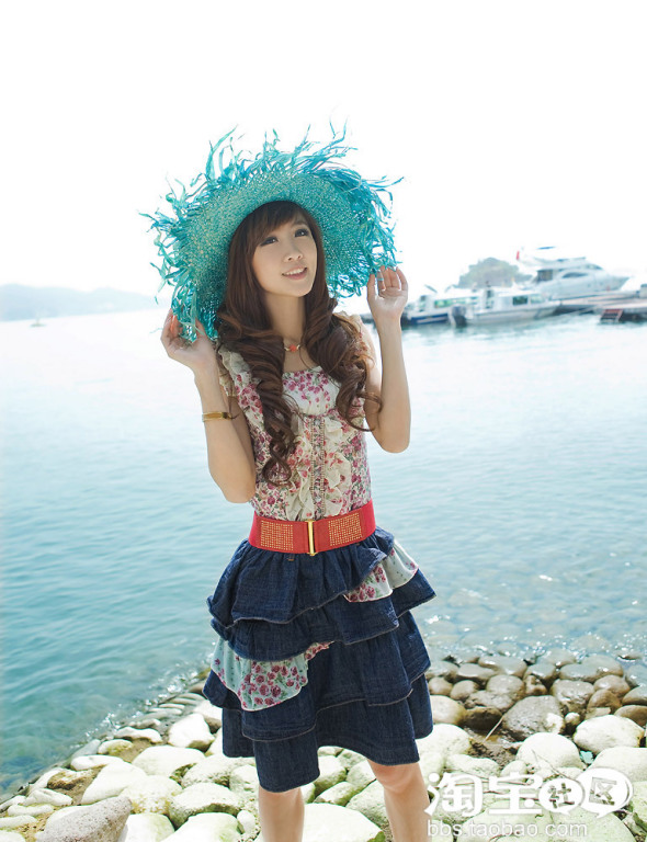 花色圆帽配上褶皱牛仔裙有点味道哦!