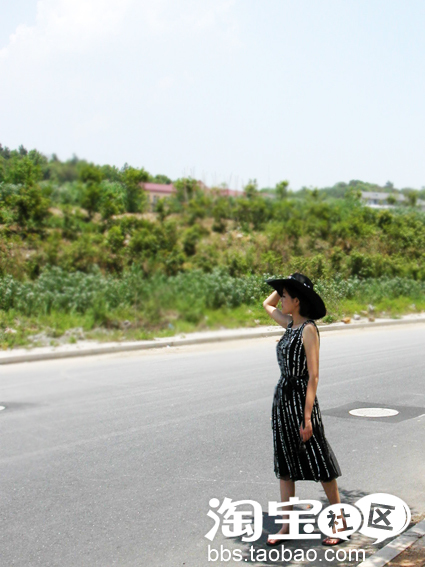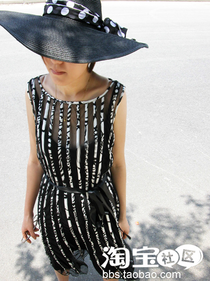 2件套条纹水墨连衣裙+黑色大草帽+黑色夹脚拖
