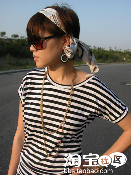 不规则黑白条纹T+浅色头巾+金色长项链+水洗做旧牛仔短裤+黑色手包+短靴
