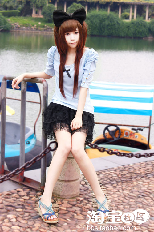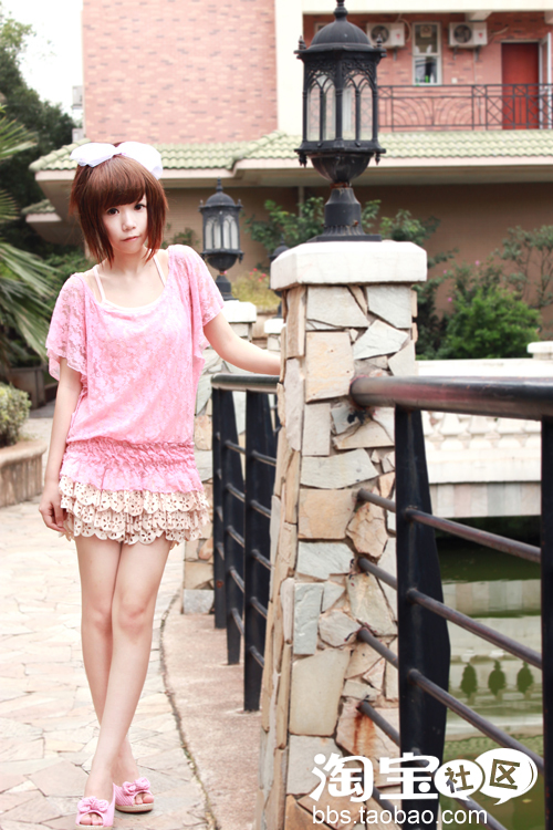 (很萝莉的露肩雪纺蕾丝上衣+蛋糕雪纺的裙裤。超萌的哦。)