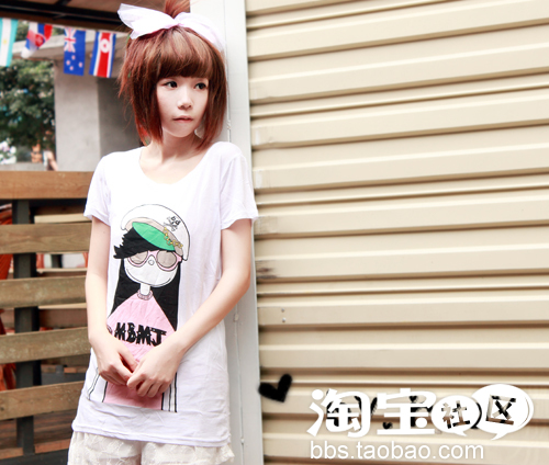 (卡通图案宽松棉T恤 + 蕾丝小短裤。)轻轻松松出门。很清楚又舒适。平常散步之类 的最合适不过了。
