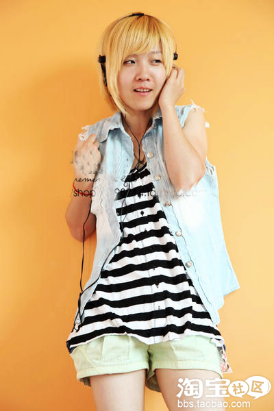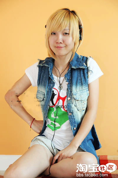 首先我要介绍的这套出来的感觉是偏帅气一点,偏中性一点的,酷一点的。。。。对不起,形容词用得有点多了哈。这款马夹本身给我的感觉是这样的,我就顺水推舟得搭配的简单的白色T恤(图案颜色不要太花,但是要有亮点),然后加了一条牛仔拼接的小灯笼短裤。恩,绝对就是我要的感觉了。简单大方,又释放出一种帅帅的感觉哈哈。戴上大耳机,就好像在说:周围发生什么都和我没关系,我就是酷到底!长款马甲的直线条修身,显高呀,呵呵,上图