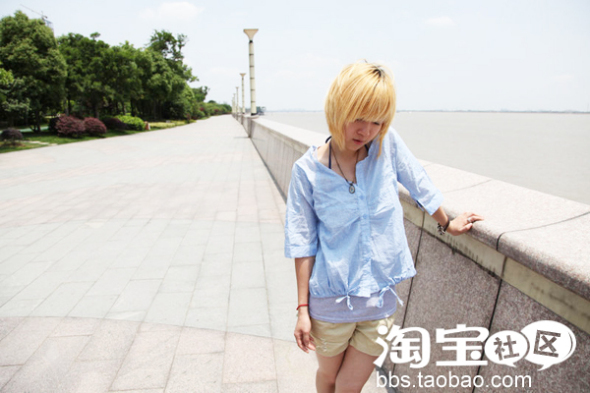 4. 小清新风格。炎热的夏天里出现一套很清新的装扮,着实让人心动哈。半透明的小衫+吊带+工装小短裤。一个词,清凉!啊,真是清凉!颜色的选择也满重要的哦,小jue在这边选的是天蓝和白为主色。因为天空的蓝和云朵的白永远给人一种清新的感觉哇!