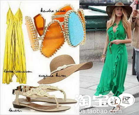 只要关联到度假风格,就一定会出现这样的长裙和波希米亚风格的平底凉鞋的组合,这个习惯几乎在近两年内都没有变过.如果渠道有海边的城市旅行,这样的组合的确很不错.另外,宽檐帽一定要带上,它不仅可以避免晒伤皮肤,而且看起来还很优雅,我去年卖过一顶,一直没机会戴.裙子的颜色当然越鲜艳越好,据说女人只要看到鲜艳的颜色心情就会大好呢.我在众多网店里找到了这条与S那条又异曲同工的裙子,吊带,V领鲜艳的明黄上衬有水彩画一样的印花.真的好好看。