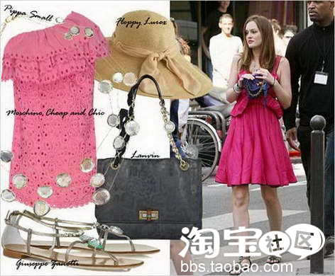 粉红色一直承蒙富家小姐厚爱,虚拟的芭比,过期的千金小姐paris hilton都很爱穿粉红色.在巴黎的B理所当然也要演绎这一颜色,背心式连身裙和平底凉鞋的搭配很亲民,小巧的长肩带包包也很可爱~.我找到了这条一样很漂亮的Moschino 单肩连衣裙,我非常喜欢这条裙子的手工镂空花和有层次的外翻大领子.款式简单并嵌有宝石的金色平底凉鞋和长款项链呼应.Lanvin的这只包包和B的一样可爱,在加上一顶可以遮挡阳光的宽檐草帽,很有富家女的泛。