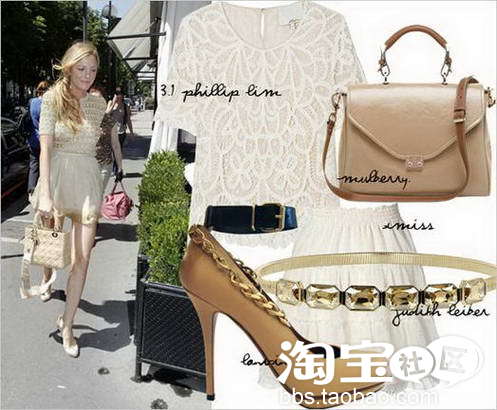 这是我最爱的look!圆领短袖上衣和crepe mini skirt的搭配超级可爱~上衣上的手工lace看起来很华丽~裸色系的小巧黛妃包搭配的恰到好处.我按照这身找了几件:3.1 phillip lim的top,日本Xmiss的mini skirt,judith leiber的细腰带,Lanvin的卡其色高跟鞋和杀伤力很强的Mulberry 以主角命名的裸色Mulberry neely 。