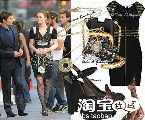 小黑裙一直是优雅的象征,从赫本开始就一直延续至今.如今的小黑裙以各种款式应对各种挑剔的优雅客户.作为聚会来说,张扬的B选择了这条全身闪闪发光的小黑礼服,搭配了同样夺目的晚宴包.另外这双蕾丝花纹的袜子真的很美,改明一定要特别来说说美化女人双腿的袜子们。