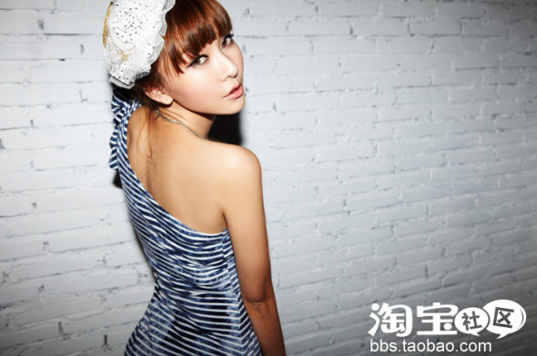 夏天嘛,蓝色当然是首选咯~~条纹也是经典!这样特别的斜肩款~~其实只要瘦的MM穿都好看~但建议肩膀比较宽的MM不要轻易尝试哦!因为一不小心很容易就会穿得有魁梧的感觉了~~头发也扎起来比较好~,因为是有点先露背的,头发放下就不好看了哦~