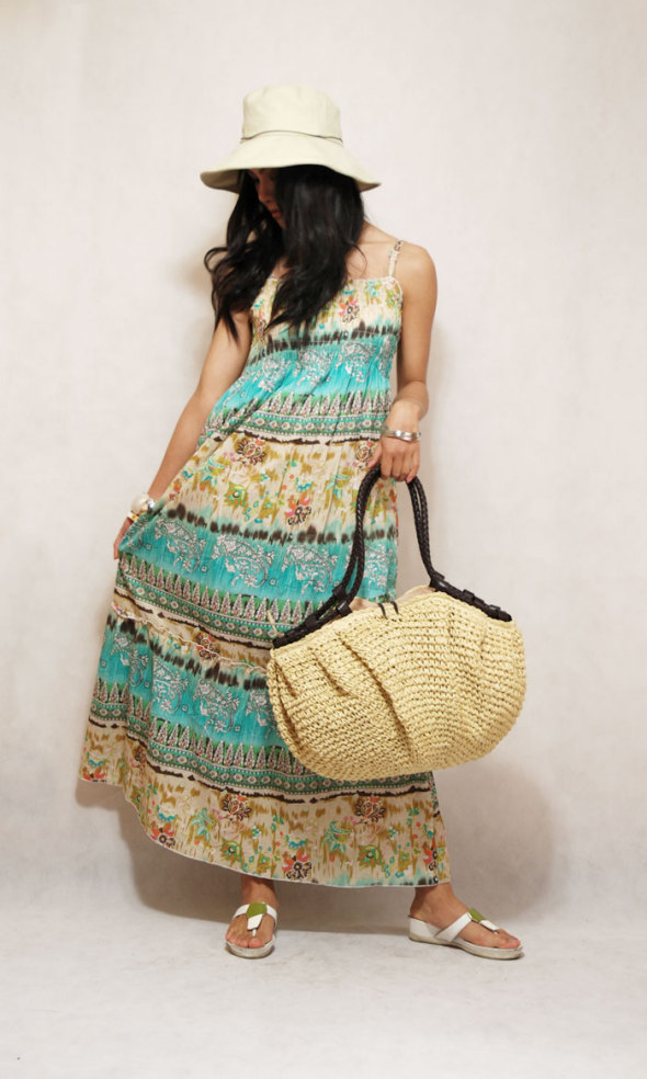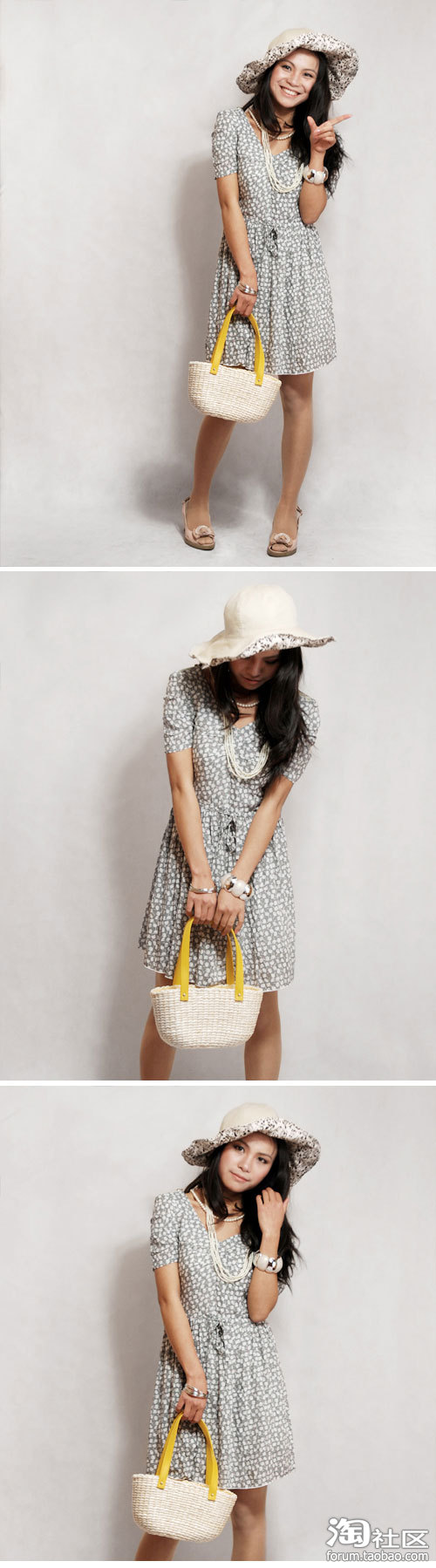 有些小折的半身裙上面洒满了白色的小花瓣,恰到好处的V形领口是不是专门为喜欢饰品的你准备的呢,一串珍珠项连,一个大大的香奈儿款的手镯,再拿上一个藤编手袋,这一切都是自然的感觉,当然忘不了一顶与裙子相呼应的遮阳帽。