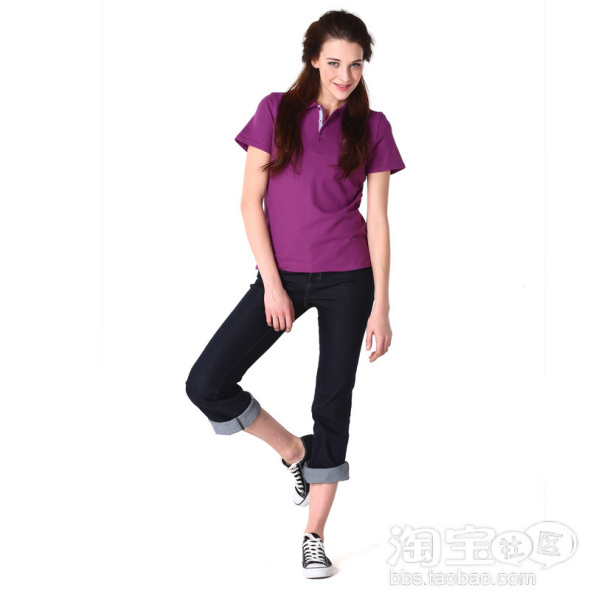 紫色T恤搭配紧身牛仔裤,包裹出女性完美的曲线,神秘甜美中不失性感妩媚。