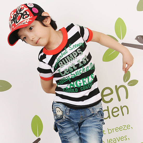 2010品牌流行童装 沙虫黑白条纹烫钻男T恤