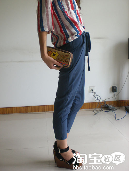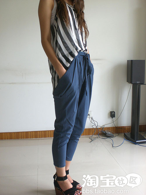 1 哈伦裤是今年夏秋绝对不能错过的款式喔!!百搭又很有型,但是怎样穿出范来,关键就在于——把上衣塞到裤子里去。因为哈伦裤有视觉膨胀感,所以上衣就不能耷拉下来盖住裤子喔,那样就褶皱的存在就毫无意义了。所以不管你是怎样的上衣,再普通的T一塞进去,气质立显喔!